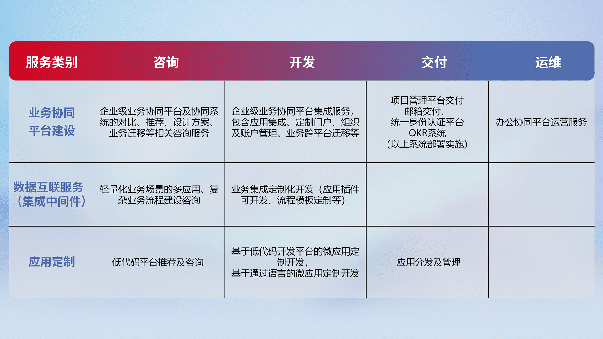针对钉钉、、、企微、、、IDaas等平台级产品提供产品的规划、、、方案、、、、交付、、定制化开发等服务,,实现如统一协同办公、、、、智能客户服务、、、混合会议管理、、智能数据查询、、等业务场景,,,实现数字化转型。。